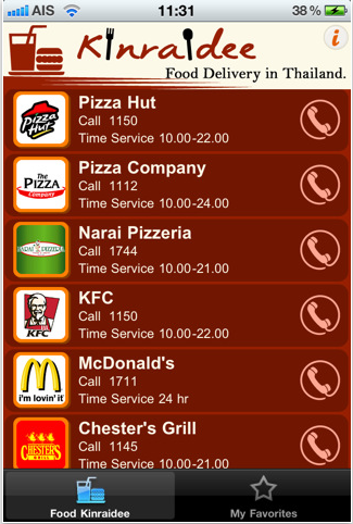 ในส่วนแรกนี้จะรวมเบอร์ร้านอาหาร Delivery สำหรับสั่งมากินที่บ้าน ที่เห็นตอนนี้ก็จะมี Pizza Hut, Pizza Company, Narai Pizzeria, KFC, McDonald's, Chester's Grill, S&P, MK, See Fah, JJ Delivery, Oishi, และ Yayoi ทั้งหมดนี้จะแสดงเบอร์ และคลิกโทรออกได้ทันที และยังทำลิงก์ไปเว็บไซต์ของแต่ละร้านเพื่อดูเมนูอาหาร ราคา และโปรโมชั่นได้ด้วย