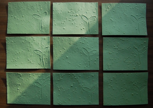 ไม่เพียงเท่านั้น Kelsey Pike's Sustainable Papercraft Studio ยังมีผลิตภัณฑ์เจ็บๆจากกระดาษรีไซเคิลอื่นๆอีก อย่างโปสการ์ดเมล็ดพืช Seeded Postcards. ทำจากกระดาษรีไซเคิลเช่นกัน ประกบเมล็ดพืชไว้ภายใน เมื่อจะนำไปปลูกก็เพียงเอาไปแช่น้ำ หลังจากนั้นก็เอาไปวางบนดิน ภายใน 5วันก็จะมีต้นอ่อนงอกออกมาจากโปสการ์ด ทีนี้จะกินหรือจะปลูกต่อก็แล้วแต่ความต้องการละค่ะ คุณสามารถเขียนข้อความบนโปสการ์ด และส่งถึงคนรู้ใจได้สบายๆ เหมาะจะทำส่งให้หวานใจวันวาเลนไทน์เลยนะเนี่ย