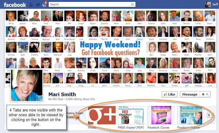All tabs were visible with the old design on the left hand side of the Facebook page previously you were able to put your custom tabs. The implications of this is that you will need to choose wisely which tabs you want to place here.