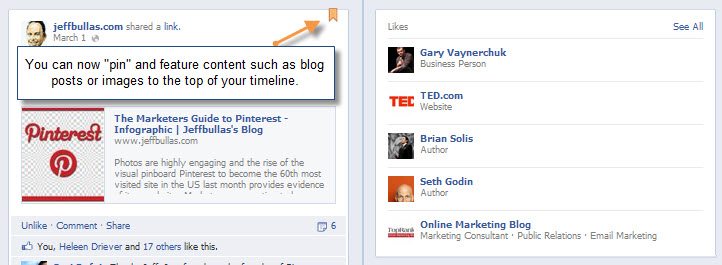 You can now "pin" content that you want to appear at the top of the "Timeline". This will allow you to feature content such as blog posts, images or calls to action in this prominent position.