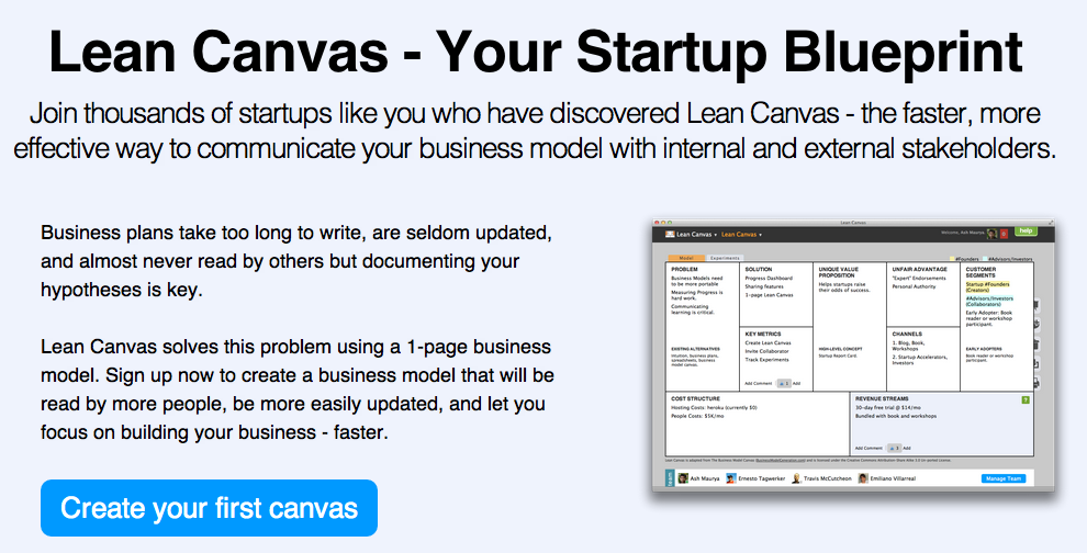 Leancanvas พัฒนาโดย Spark59 เปิดให้บริษัทต่างๆ สร้างโมเดลธุรกิจด้วยเครื่องมือในรูปแบบนี้ได้ มี package ราคาที่แตกต่างกัน และเปิดให้ทีมงานสามารถเข้ามาร่วมใช้ได้ โดยทุก package จะมีให้ทดลองใช้ฟรีก่อน 30 วันแถมยังแจกหนังสือในรูปแบบดิจิตอลอย่าง Running Lean (2nd Edition) ให้กับทุก package อีกด้วย แต่ถ้าใครยังไม่แน่ใจว่าจะดีไหม ก็มีแบบฟรีให้ลองใช้ก่อน